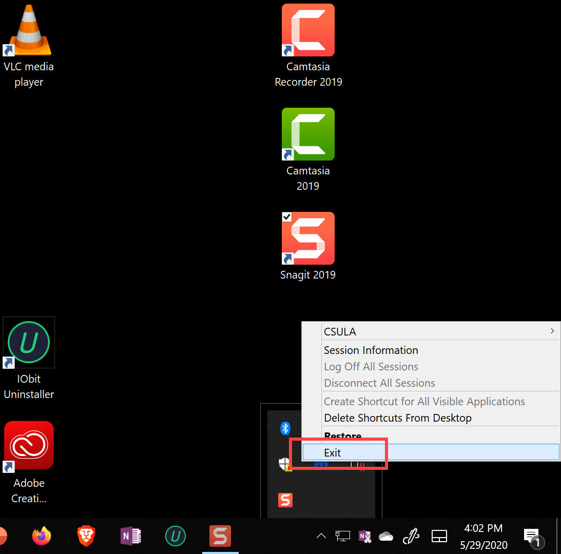 Therefore, to completely stop the Parallels client from running on the computer, the Exit option on the popup menu should be selected as shown in the next diagram to stop the Parallels app.