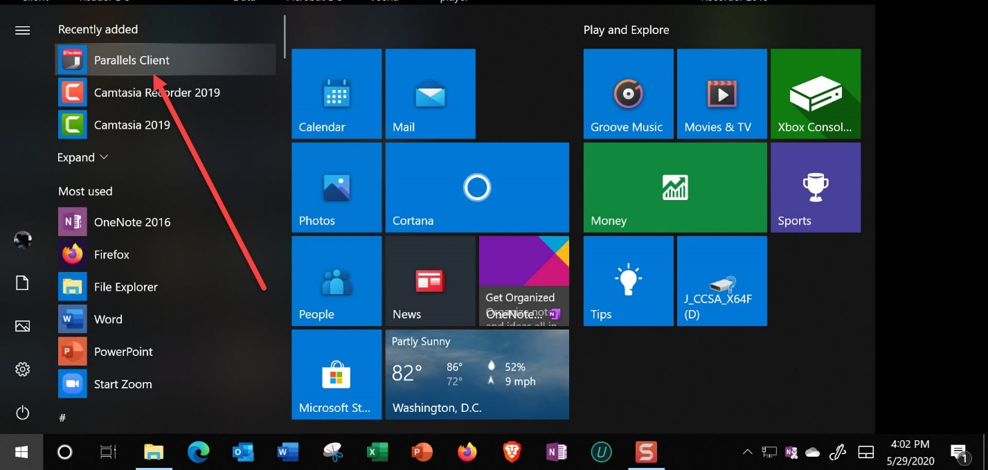 The other approach would be to go to the Windows start button at the bottom left-hand corner of the screen and search for the Parallels app. Click on the Parallels app listed on the screen as shown in the next diagram to launch the app.