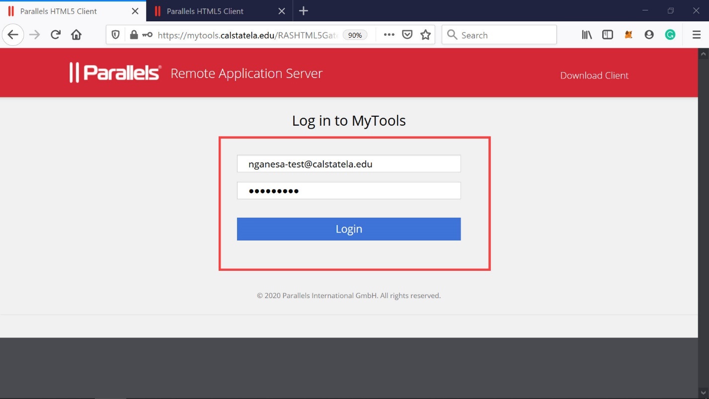 Now, the “mytools” web page for logging into the remote application server will be displayed as shown in the next diagram. Click on the download client navigation link on the page to download and install the Parallels client.