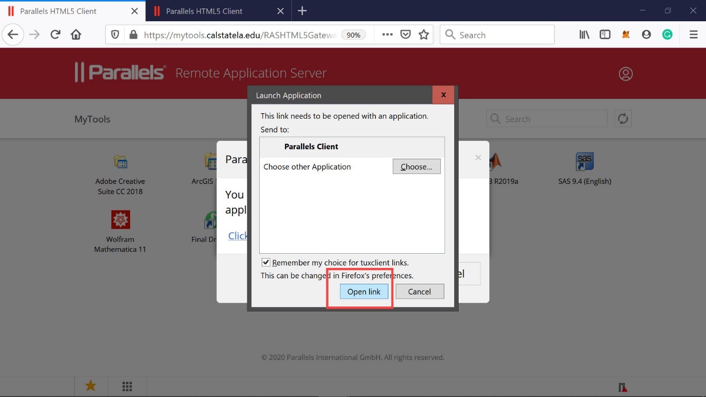 Click on the login button to log into the remote access server. The screen shown in the next diagram will now be displayed. Click on the button labeled Open Link to connect to the remote access server. Since the option that indicates “remember my choice” is ticked, this box will not appear the next time when logging into the server.