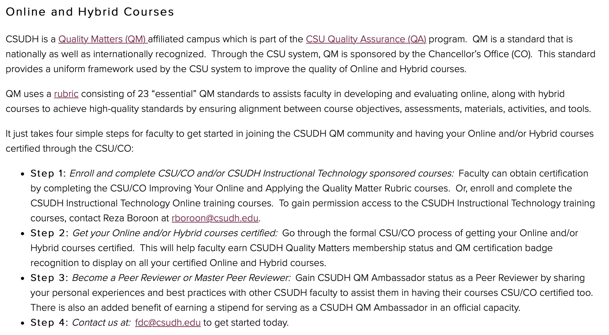 Today, all members of the CSUDH faculty community, who are teaching online and/or hybrid courses, have not satisfied the minimum standards of quality assurance, such as Quality Matters.  Currently, CSUDH is in need of additional training to create a process that will assist in developing a foundation to ensure online and/or hybrid courses have structure to prepare faculty to do an effective job to teach online and/or hybrid courses, as well as to prepare students to succeed in a virtual learning environment.  Additionally, there is a need for CSUDH faculty to have access to certified online training that will assist in facilitating peer-reviews for online/hybrid course certification through the CSU Chancellor’s Office program.