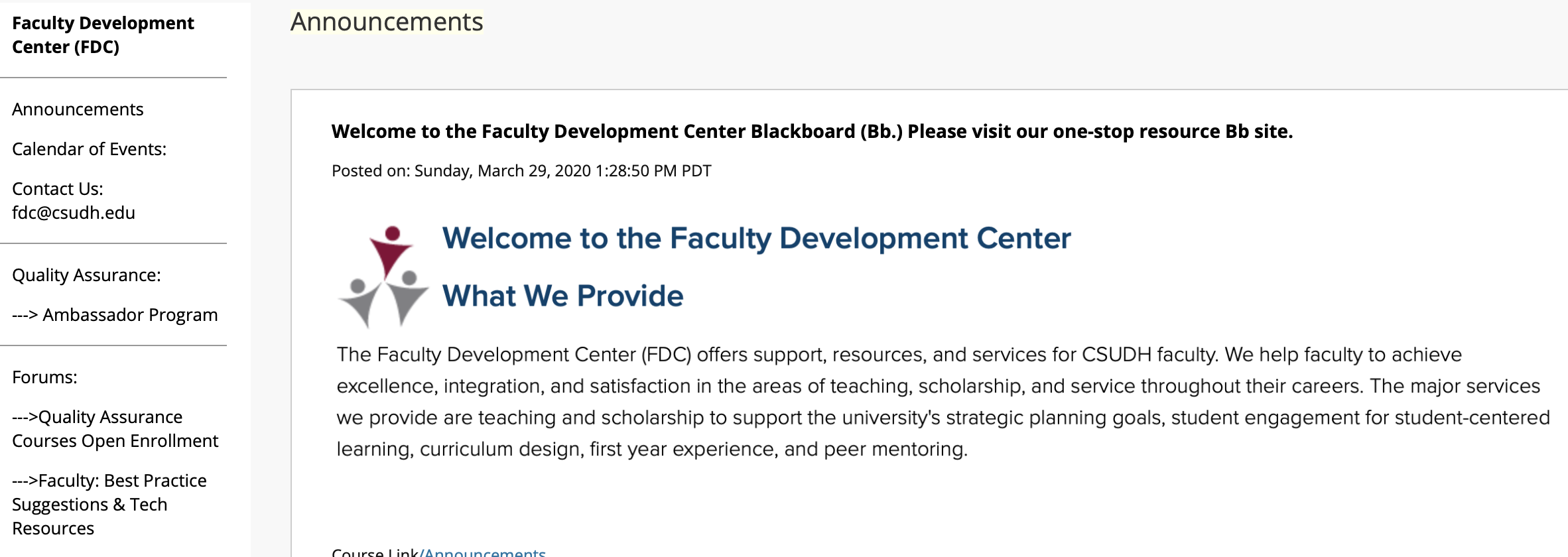 • Office of Academic Technology Workshops:  FDC is working in Partnership with the Office of Academic Technology Department to continue to cross-train faculty in more introduction to online teaching workshops, as well as technical online training workshops providing faculty instructions on how to effectively utilize Blackboard features and other CSUDH licensed software applications, i.e. Zoom, TechSmith Relay, Respondus, etc., in an online environment. Technology workshops cover various topics, including:  Assessment of Student Learning, Turnitin – Improve Writing and Prevent Plagiarism, Creating video and audio for courses using TechSmith Relay, Creating Engaging Content - Getting Started with your Course, and Communicating with Students with Zoom and Blackboard Collaborate.