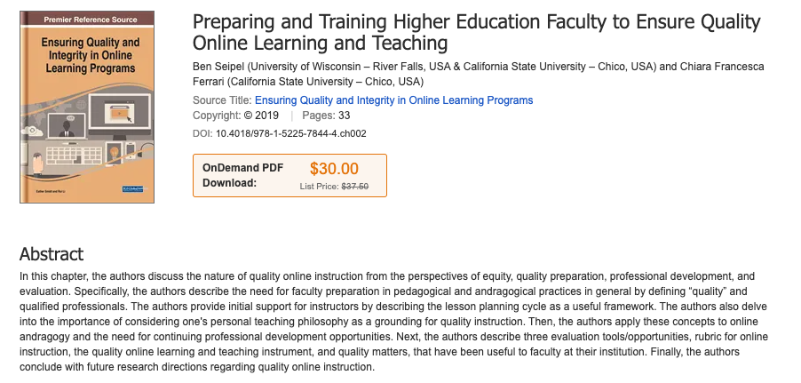 The QA lead co-authored an article in 2019 titled “Preparing and Training Higher Education Faculty to Ensure Quality Online Learning and Teaching” and published by IGI Global. The chapter discusses the nature of quality online instruction from the perspectives of equity, quality preparation, professional development, and evaluation, and shares the QLT experience at Chico State with international readers.