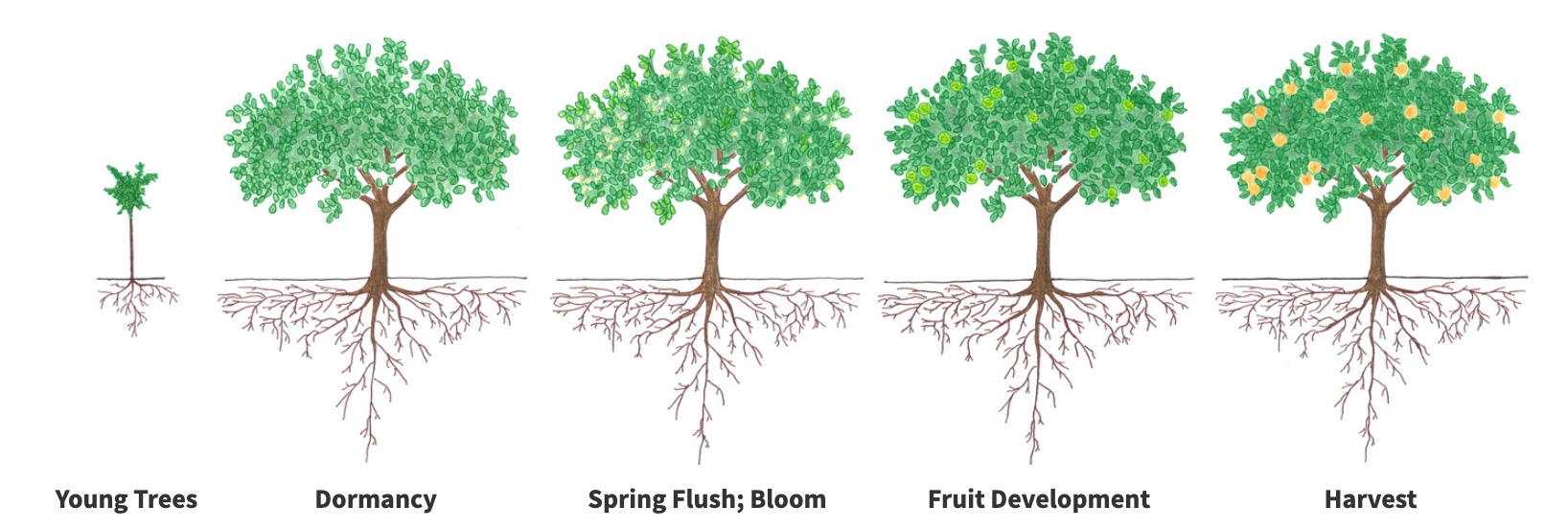 The typical citrus growth cycle in the northern hemisphere starts with dormancy during winter, spring flush and bloom, followed by fruit development and harvest in fall or winter. In the coastal regions of California, however, many citrus trees bloom year-round. Read in the blog post by the University of California Cooperative Extension in Ventura about implications of the behavior of the coastal citrus tree for fertilizer management.