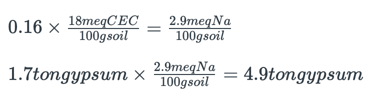 ESP of 26% – desired ESP of 10% = ESP of 16, or 16% exchangeable Na must be replaced with calcium (Ca) to achieve the desired ESP.