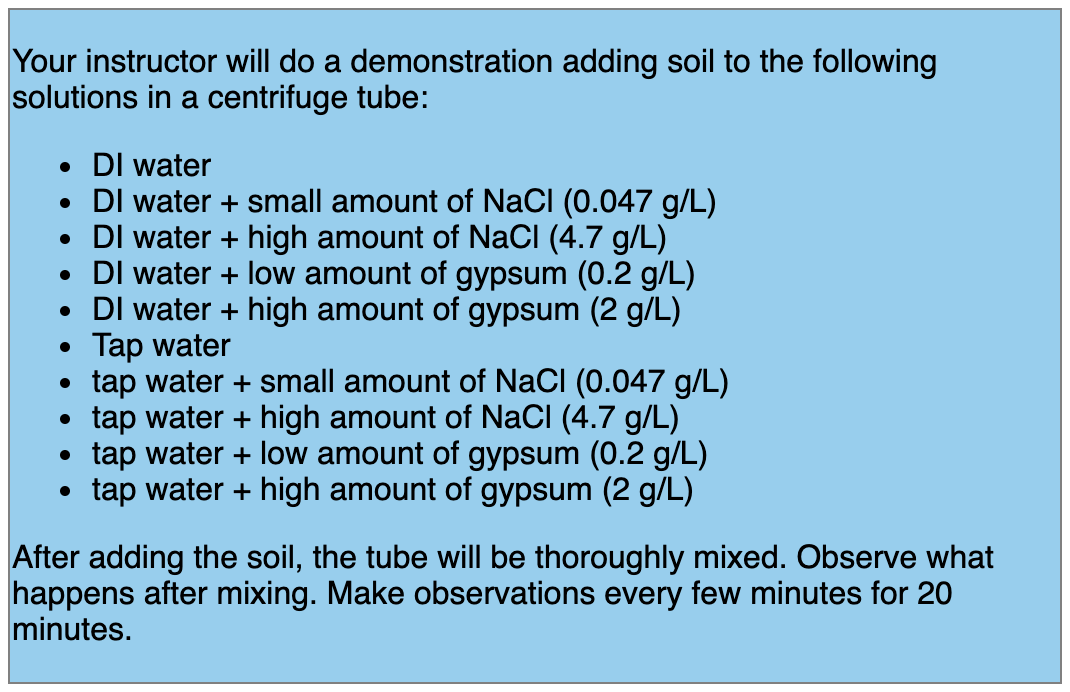 We saw in the videos how addition of sodium dispersed the clay particles, and addition of gypsum flocculated clay particles. Let's see if we can disperse and flocculate the soil from the lemon orchard.