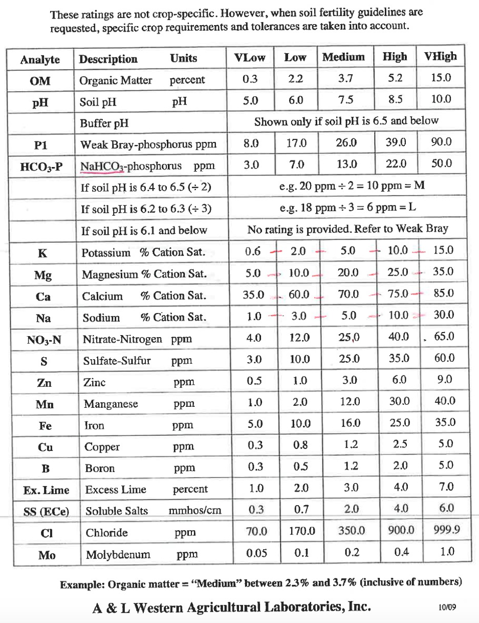 Use the guidelines below to guide the interpretation of your soil test report. Note, interpretation guidelines change as new research findings become available. The interpretation guidelines below are excepted from a document that used to be publicly available from the A&L laboratories website. Current interpretation guidelines used by commercial laboratories may have changed.