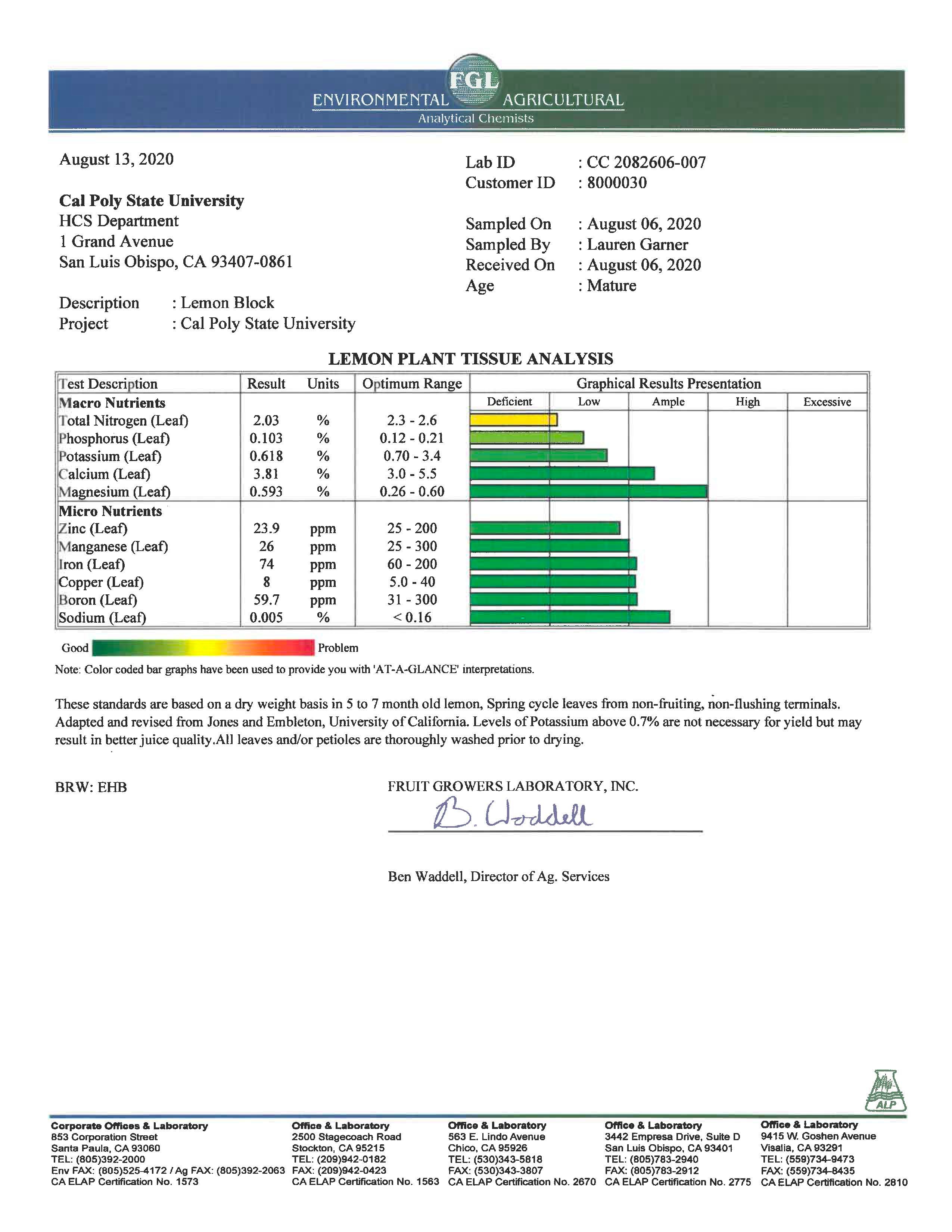 Table: Mock soil test Report, SS 221 Soil Health and Plant Nutrition, Cal Poly lemon orchard, Sampled Spring 2020
