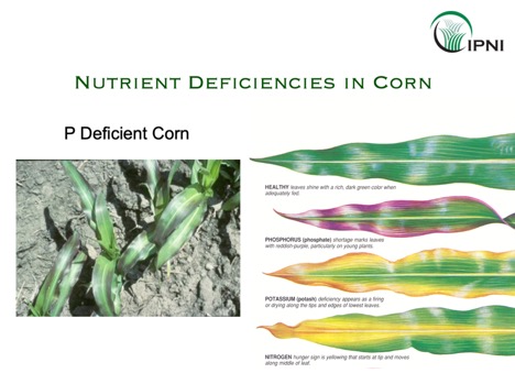 Phosphorus (P) plays a role in many plant functions. Most notably, P is an important constituent of DNA and a building block of Adenosine triphosphate (ATP), essential for energy storage and transfer. Symptoms of phosphorus deficiency in corn are generally observed by purple discoloration on the leaves.