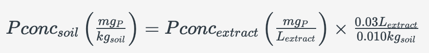 The measured P concentration in the concentration in the extract. We want to know the P concentration in the soil. The P concentration in the soil can be calculated as follows: