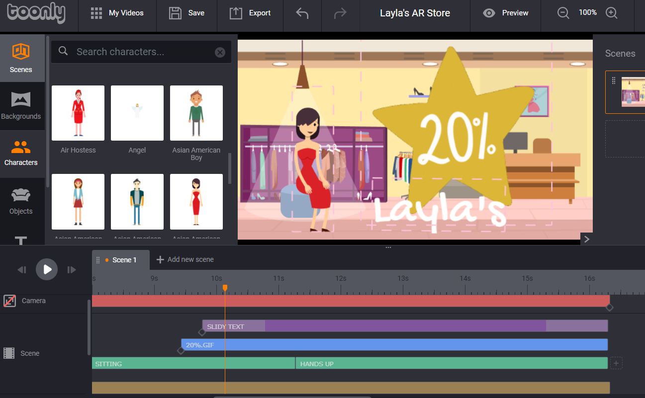The scene has a track for your character(s), a background scene, object(s) as well as tracks for music, and a voiceover. This scene shows my character, Layla, the boutique owner first waving hello, crossing the scene, having a seat, and then ends up cheering as a 20% off coupon pops up. There is nothing special about this particular part of the project, it was me playing and learning how to navigate layers and actions on Toonly.