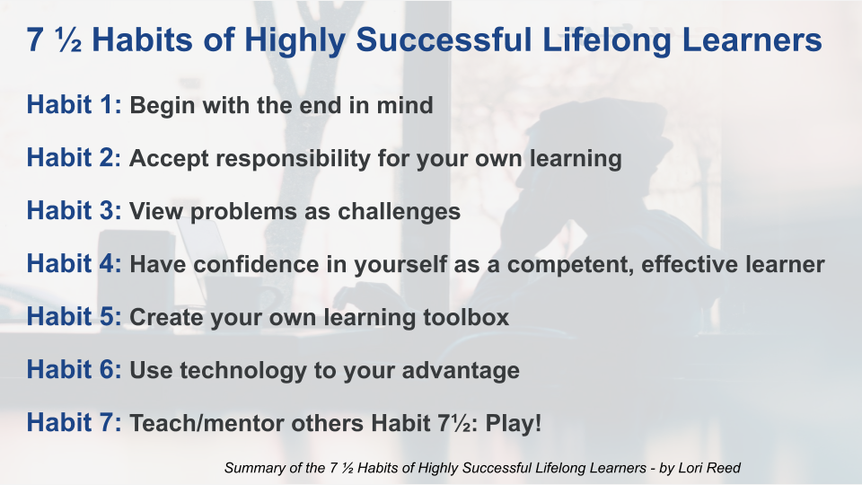 After reading the 7 1/2 habits of successful lifelong learners, I found that I am following habits 1,2,3 and 6 very well. Habit 4 is where I struggle, since I am person with a mix of both growth and fixed mindset. At times my fixed mindset becomes prominent and I undermine my abilities as a learner. I have to practice more on Habits 5 and 7.