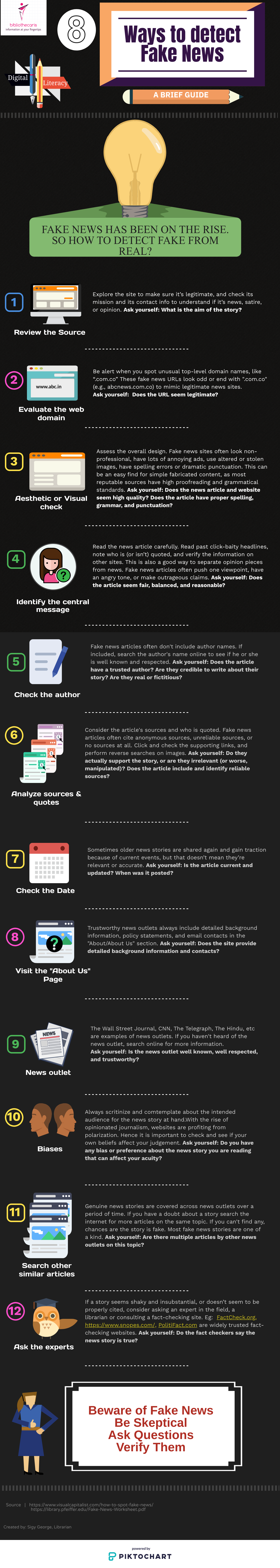 With today's era of information explosion we are inundated with information and news from all types of sources. This had led to thinning of line between real and fake news. Hence, I used Piktochart to create an infographic on how to detect fake news.