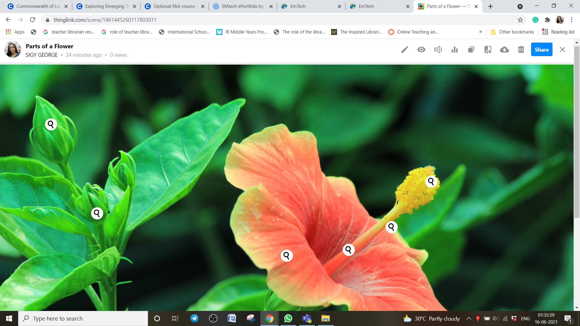 The tool I explored under Creativity module is Thinglink. Thinglink can annotate images with text, audio, or video. Using this tool I created an interactive infographic for primary students which explains parts of a flower. The various icons and freedom to add any medium into Thinglink make it highly useful and a needed utility to create visually appealing content.