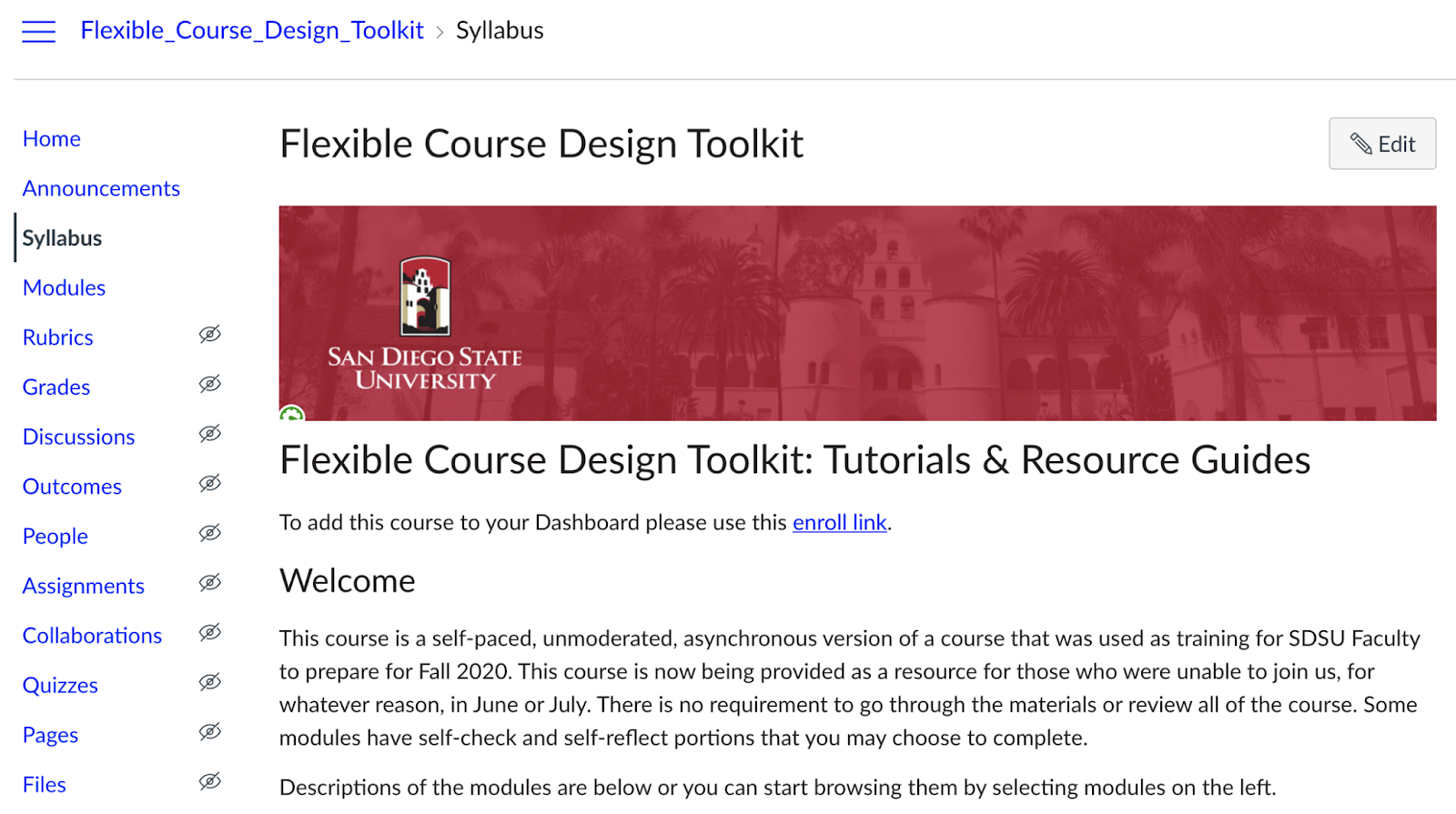 SDSU Flexible Course Design Toolkit (developed via the Flex CDI training program): https://sdsu.instructure.com/courses/58304