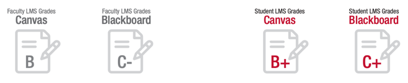 Faculty assigned Canvas a 3.4 GPA or B and Blackboard a 2.0 or C-. Students (report cards on the right) assigned Canvas a 3.5 GPA or B+, and Blackboard a 2.9 or C+