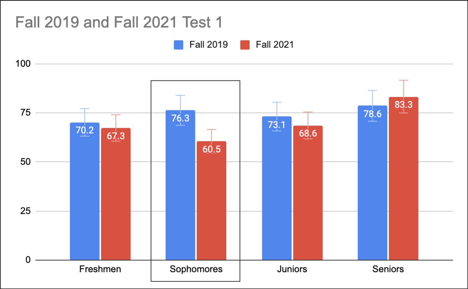 Our SQuAIR research this year focused on student performance as students returned to the in-person classroom in the Fall 2021 semester. Early evidence from one large Introductory General Education course, PSY 101 (Introductory Psychology), taught by Mark Laumakis, QA Faculty Lead, indicated that Sophomores in particular were struggling academically. Data from PSY 101 on all 4 tests followed this same pattern shown on Test #1, with Sophomores underperforming vs. their pre-pandemic performance:
