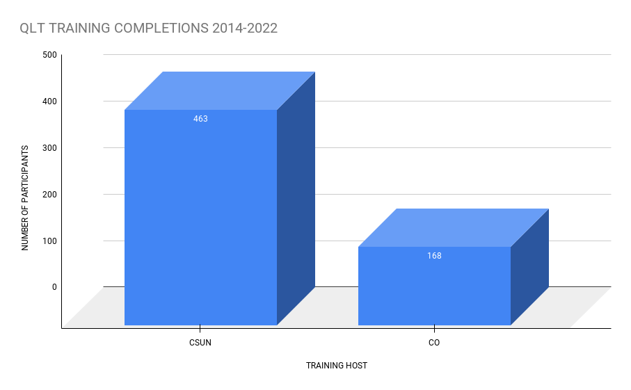 2014- 2019:  Over the years, CSUN has made significant efforts to disseminate the QLT rubric among faculty and campus leaders. Some of the previous accomplishments include: integrating QLT in the face-to-face eLearning programs, such as the Institutes and the Online Teaching and Learning series; creating and maintaining a QLT webpage; holding a 2-day retreat for department chairs; presenting at the Association for Educational Communication and Technology (AECT) Conference, and hosting peer review trainings and other types of QLT workshops on campus.