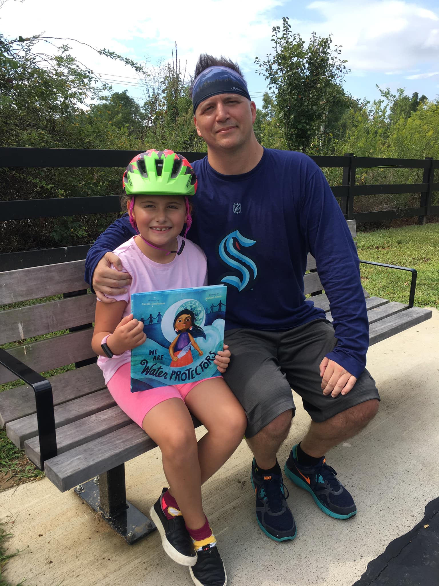 A  father and daughter out biking the Town Center Greenway stopped and enjoyed the story We are Water Protectors, by Carole Lindstrom. She wants to be an author when she grows up.