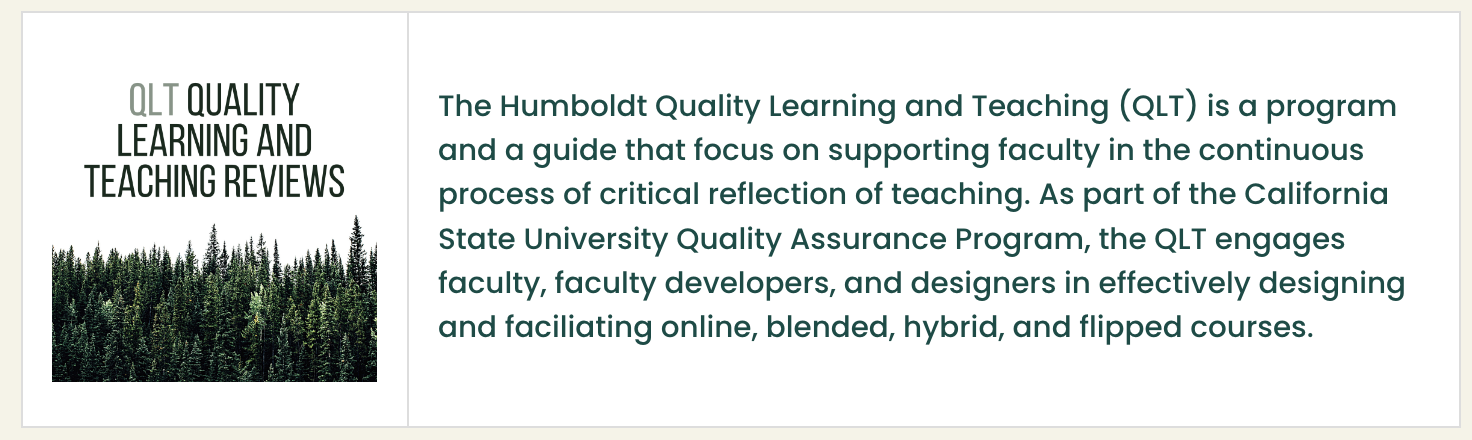 The Center for Teaching and Learning's (CTL) goal is to support high quality online/blended instruction that improves students’ experiences, academic success, and timely progress to graduation through a broad organizational approach that embeds quality assurance (QA) into our campus culture. The CTL has helped guide this work to better integrate faculty development, pedagogy, technology, and context in alignment with QA efforts, GI2025, CSU Priority 5, and Humboldt’s strategic plan. Associated programming guides the design of course structures, artifacts, technology, and pedagogy informed by the Quality Learning and Teaching (QLT) instrument.