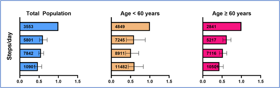 As seen in Figure 4, the risk of mortality decreases with increasing step counts, but the association is different in younger than older adults. The hazard ratio for all-cause mortality plateaus (e.g., no further decrease in mortality/benefit) at approximately 6000-8000 steps per day in adults aged 60 years and older, whereas in younger adults the plateau was approximately 8000-10,000 steps per day. These data also suggest that increasing steps per day from about 3500 to 5800 is associated with the greatest reduction in mortality risk.