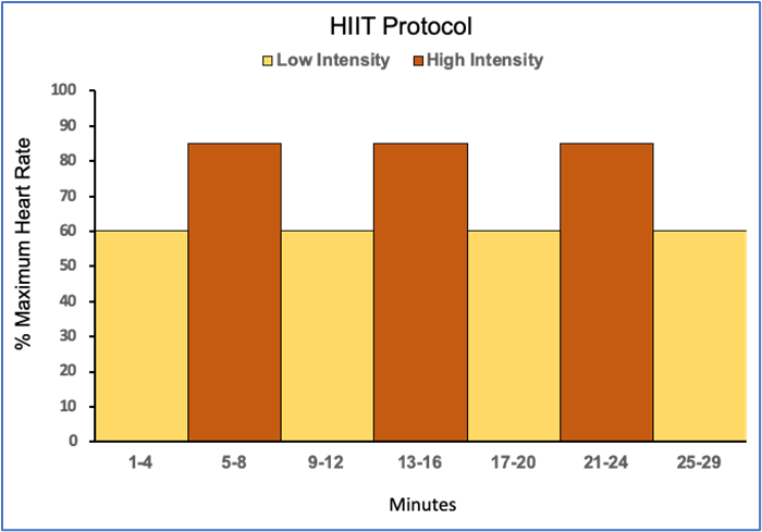 HIIT is high-intensity interval training. Although HIIT is used to describe many types of exercise workouts in the fitness industry, it is specific to short intervals of high- to very-high intensity exercise such as running or cycling alternating with lower intensity recovery intervals. The adaptations to HIIT are often compared to continuous moderate-intensity exercise. From an exercise behavior perspective, one advantage of HIIT is that a given caloric expenditure goal can be reached in a shorter session than continuous moderate-intensity exercise. Some people find HIIT less boring than continuous exercise. Figure 6 depicts a HIIT protocol for treadmill walking or jogging that was developed for older sedentary adults. Lower intensity intervals (60% of maximum heart rate) were alternated with higher intensity intervals (85% of maximum heart rate); each interval was four minutes in duration. The number of intervals progressed over several weeks as did the heart rate target for the high-intensity intervals. A 5-minute lower intensity warm-up and cool-down would bookend the series of intervals.
