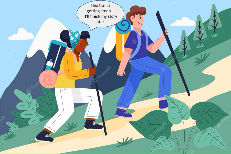 Perhaps the most convenient way to monitor aerobic exercise intensity is the Talk Test. During aerobic exercise that elicits 64-95% of maximal heart rate (i.e., moderate intensity), the exerciser can carry on a conversation, count, or recite a sentence (Reed & Pipe, 2014, 2016). At a higher exercise intensity, cardiorespiratory demand exceeds the capacity to also speak, and the exerciser becomes “breathless” (e.g., more anaerobic), until exercise intensity decreases, or exercise is stopped. Here is a practical example of the Talk Test (Figure 7): two exercise buddies are walking a trail and enjoying conversation. When the trail steepens, cardiorespiratory demand increases and conversation becomes more difficult or may cease until the trail levels, cardiorespiratory demand decreases, and conversation can resume. A person with a chronic condition can use the Talk Test to monitor and adjust exercise intensity as needed, reducing intensity if they are experiencing a higher symptom burden, or increasing intensity when symptoms are less interfering.