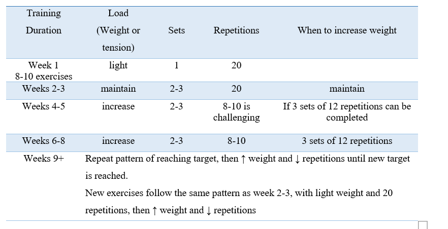 With regards to resistance exercise, progressive overload is applied to achieve increases in muscle strength (American College of Sports Medicine, 2022). Table 3 provides an overview of progressive overload for a novice, deconditioned person using machine or free weights, or resistance bands.