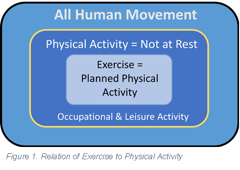 In the paragraphs above, you will find the terms “physical activity” and “exercise”. Often, these two terms are used interchangeably in public health messaging, the popular press, and social media but there are important differences. Using a “whole-and-part” relationship, exercise is a part of physical activity (Figure 3).