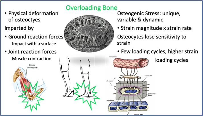Exercise, by imposing mechanical stress, imparts strain in bone that can trigger cellular signaling for bone remodeling (Figure 9). Embedded in the mineral matrix of bone, the osteocyte functions as a mechanoreceptor, translating deformation from mechanical stress through a signaling network that modulates the actions of osteoblasts and osteoclasts to build and remove bone, respectively (Dallas et al., 2013). For exercise to effectively stimulate bone formation and improve bone strength, it must impart strain that is novel in terms of direction, magnitude, and rate compared to usual forces (Turner & Robling, 2005)