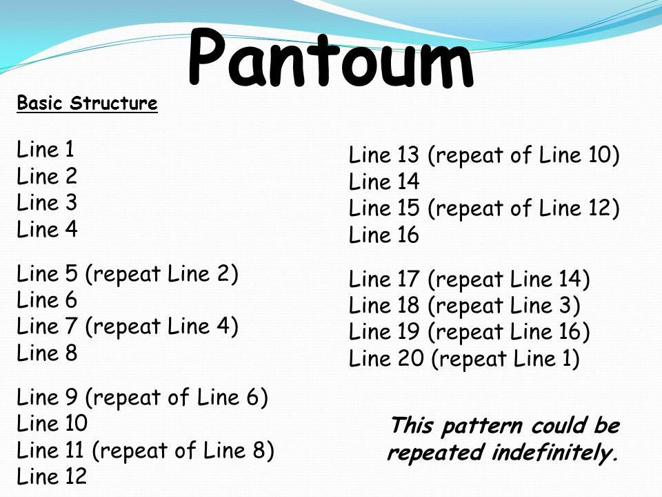 A Pantoum is a poem that can be of any length but is composed of four-line stanzas where the second and fourth lines of the previous stanza serve as the first and third lines of the next. The last line of the Pantoum is often, but not always, the same as the first line of the poem.