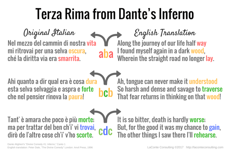 When translateing Dante's work, there have been a lot of questions on how to translate the rich rhyming possibilities of Italian into English that would make sense with the form of Terza Rima. John Ciardi, chose not to worry about reproducing a faithful translation of the terza rima scheme while Robert Pinsky chose to employ a terza rima that rhymed when possible and used near/slant rhyme to help create a "plausible terza rima in readable English."