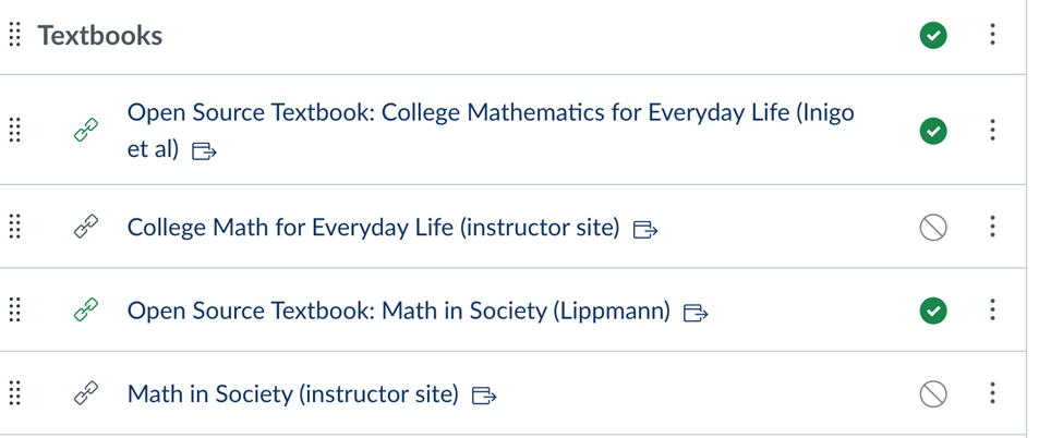 Student access: Students access these materials via website. I linked the free text in their Canvas course. Here is a screenshot of the teacher’s view.