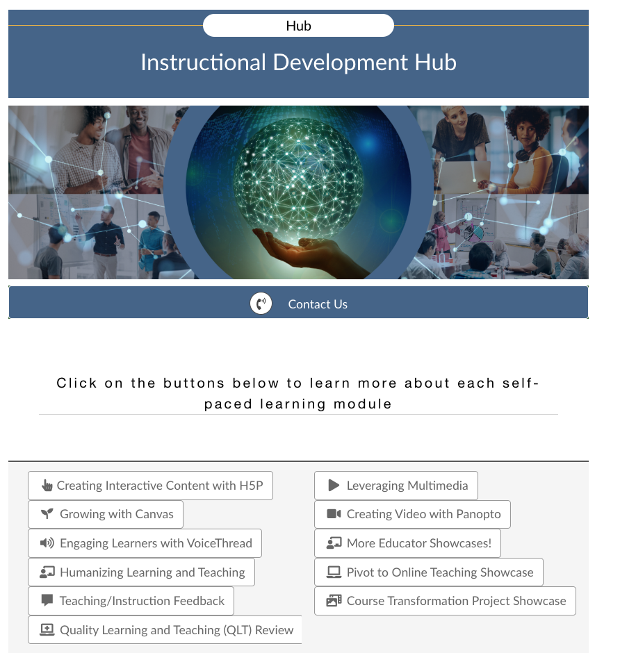 - Launched a Professional Development Hub (Canvas space) to support live workshops and 24/7 self-paced, anytime/anywhere learning modules for faculty to engage in various technologies, pedagogies, feedback mechanisms, and more