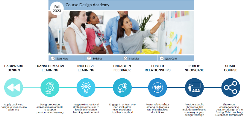 Course Design Academy with a focus on Backward Design, Transformative Learning, Inclusive Learning, Engagement in Feedback, Fostering Relationships, Public Showcase, Sharing Course