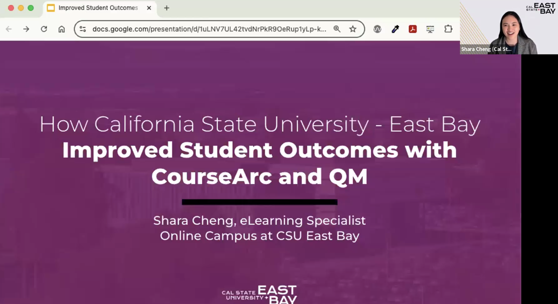 Elearning Specialist, Shara Cheng presenting a QM Webinar on How CSU East Bay Improved Student Outcomes with CourseArc and QM.
