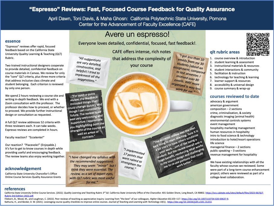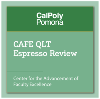 Green digital badge graphic reading: "Cal Poly Pomona: CAFE QLT Espresso Review: Center for the Advancement of Faculty Excellence"