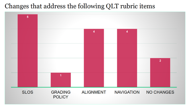 Bar graph rating the changes that address the following QLT rubric items: Column 1: SLOs: 5 Column 2: Grading Policy: 1 Column 3: Alignment: 4 Column 4: Navigation: 4 Column 5: No changes: 2To what degree do you feel that your students have benefited from your participation in the Espresso review?: (1) "“Every change that creates positive support and experience for our students is valuable.” (2)  “I have made some little changes, but more changes are on their way before I teach this course next [semester/time].”