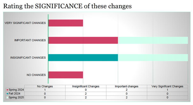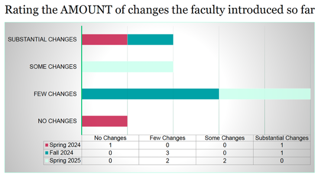 Table rating the amount of changes the faculty introduced the far: Row 1: Term, No Changes, Few Changes, Some Changes, Substantial Changes Row 2: Spring 2024, 1, 0, 0, 1 Row 3: Fall 2024, 0, 3, 0, 1 Row 4: Spring 2025, 0, 2, 2, 0Table rating the significance of changes faculty have introduced the far: Row 1: Term, No Changes, Insignificant Changes, Important Changes, Very Significant Changes Row 2: Spring 2024, 1, 0, 2, 1 Row 3: Fall 2024, 0, 2, 0, 0 Row 4: Spring 2025, 0, 2, 2, 0