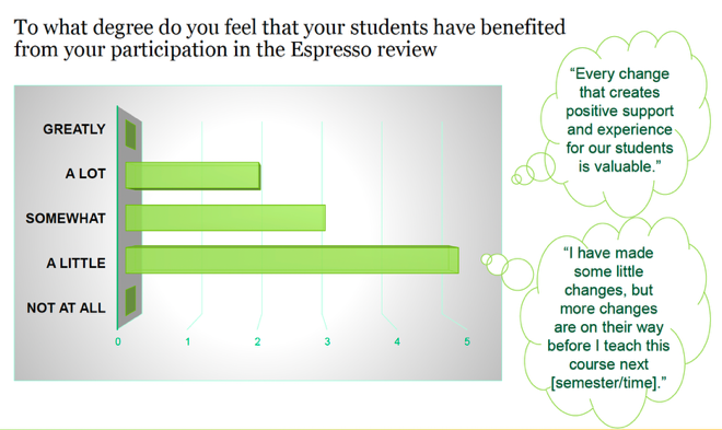 Satisfaction with the Espresso review experience was not as strong as faculty reported previously.  One faculty member had a very negative experience that likely resulted from a lack of clear communication about the nature and purpose of the review, as well as the need for CAFE reviewers to strengthen and maintain their expertise and to put ample time in to complete a review.  Generally, though, satisfaction was strong.  For future reviews, it would be very helpful to pair reviews of Canvas course sites with class visits for a fuller picture of the course.