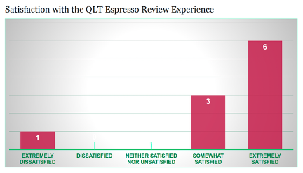 Bar chart rating faculty satisfaction with the QLT Espresso Review Experience: Column 1: Extremely dissatisfied: 1 Column 2: Dissatisfied: 0 Column 3: Neither Satisfied nor Unsatisfied: 0 Column 4: Somewhat satisfied: 3 Column 5: Extremely satisfied: 6