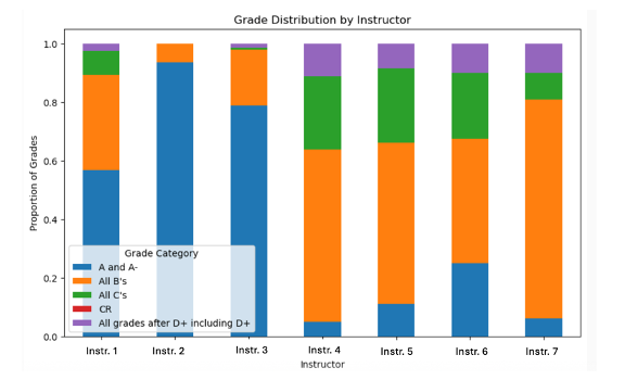 A bar chart titled "Grade Distribution by Instructor" compares the proportion of grades given by seven instructors (Instr. 1 to Instr. 7). The x-axis lists the instructors, and the y-axis shows the proportion of grades from 0.0 to 1.0. Each vertical bar is segmented by color to represent different grade categories: blue for "A and A-", orange for "All B's", green for "All C's", red for "CR", and purple for "All grades after D+ including D+". A legend in the bottom left corner explains the color coding.