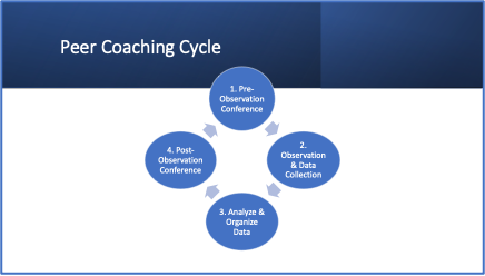 The peer coaching cycle includes 1) Pre-observation conference, 2) Observation & data collection, 3) Analyze & organize data, and 4) Post observation conference